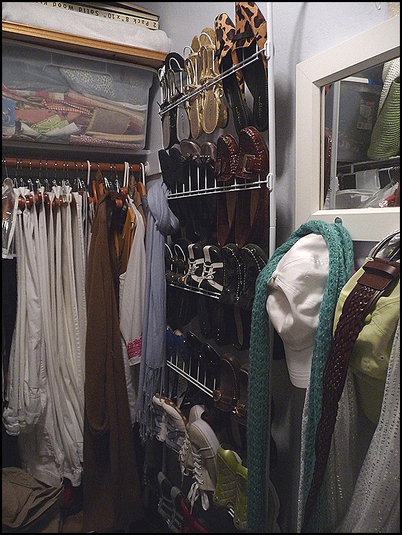 You will notice my shoe rack is full, plus I have boxes of shoes. Yes the boxes have labels, and look organized, but there are way too many that I no longer wear.
