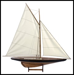 This has a stripe in the sail which I also love. It has a darker wood with a very dark blackish, green/blue paint. One thing I really love about this one is the green painted wood stand. I think that makes it interesting. This feature can be added to any of the yachts we have chosen.